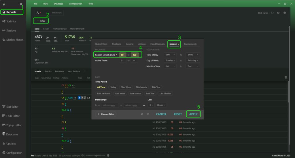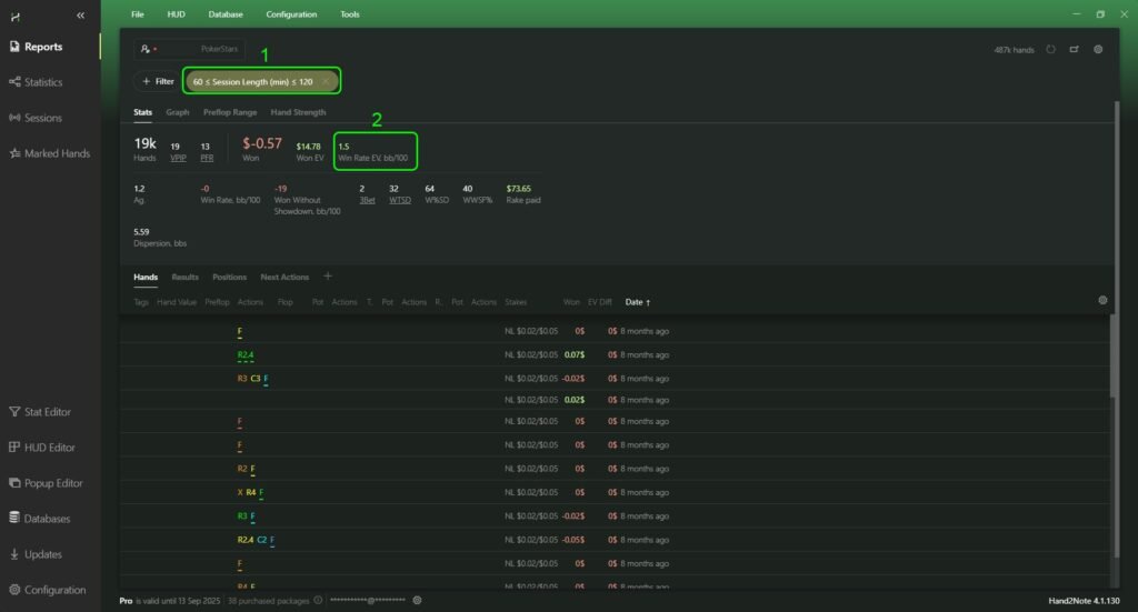 Um den gesamten WinRate EV, bb/100 für Sitzungen einer bestimmten Länge zu sehen, können wir das “Reports”-Tool in Hand2Note verwenden.