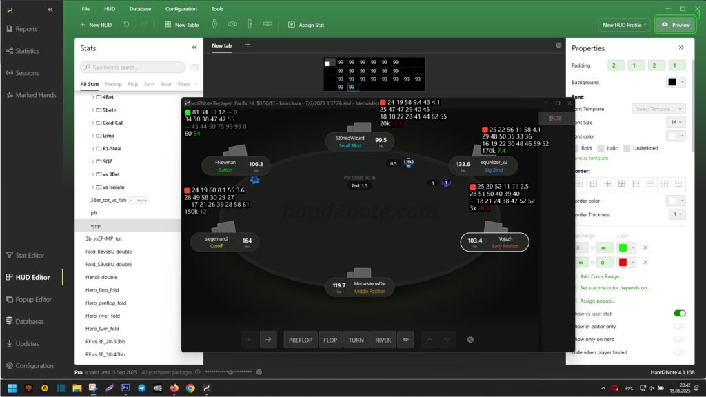 Einige Poker-Räume blockieren das HUD, wenn es dynamische oder positionsbezogene Anzeigevoraussetzungen verwendet. Zum Zeitpunkt des Schreibens sind dies: PokerStars, IPoker, Winamax. Wir empfehlen, dieses Detail mit dem Hand2Note-Support zu klären, bevor Sie das HUD bearbeiten.