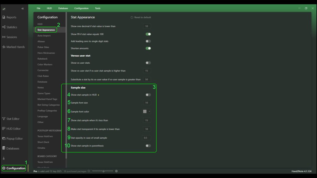 • „Show stat sample in HUD” (4) ermöglicht es Ihnen, die Anzeige der Stichprobe zu aktivieren;