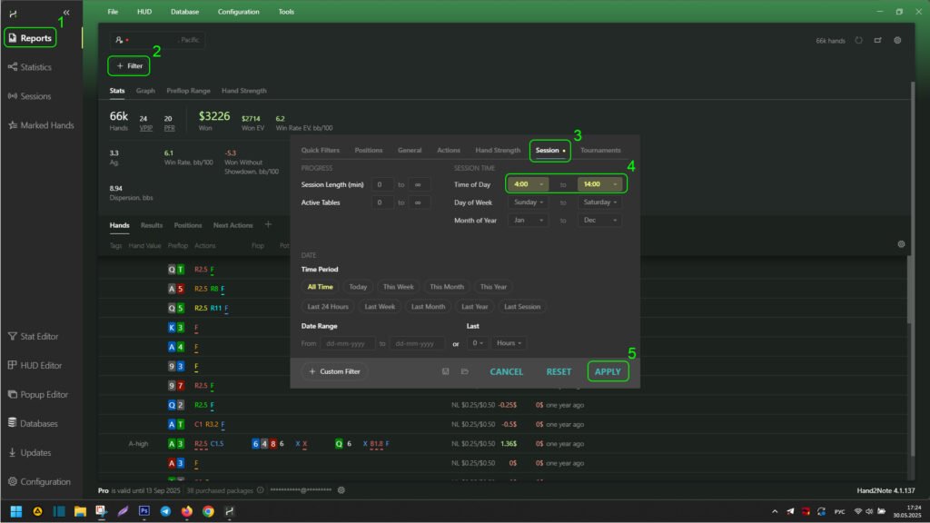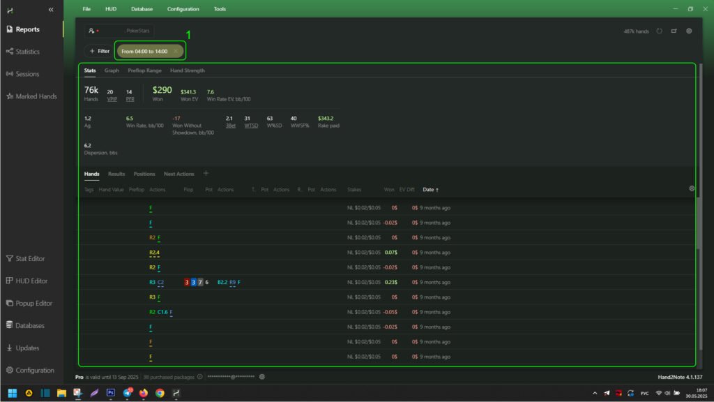 Hand2Note ermöglicht es Ihnen, Spielberichte für verschiedene Tageszeiten zu erstellen. Dies hilft Ihnen, Ihre Ergebnisse zu unterschiedlichen Tages- oder Nachtzeiten visuell zu sehen. Es hilft auch, die Frage zu beantworten: Sollten Sie Ihren Spielplan ändern oder nicht.
