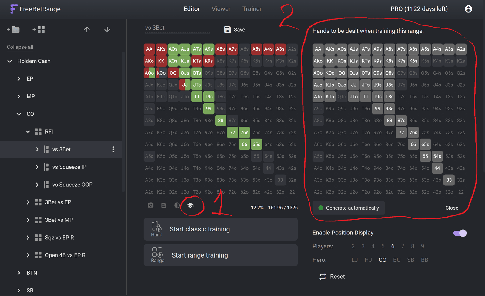 Ten en cuenta que por defecto el rango de entrenamiento no incluye todas las manos iniciales. Un script inteligente ya ha filtrado las manos demasiado obvias. Aun así puedes personalizarlo más si lo deseas. Por ejemplo, puedes eliminar también la parte superior del rango (manos premium como ases o reyes). Si quieres volver a la configuración predeterminada, haz clic en el botón “Generate automatically”.