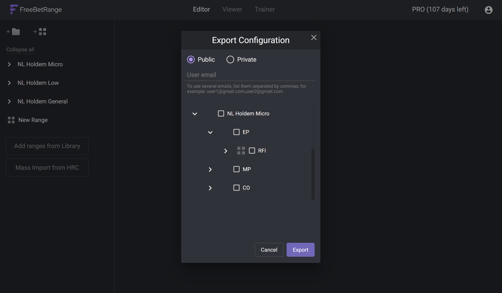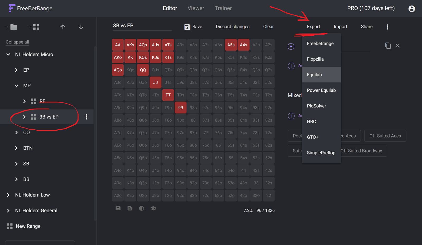 También puedes exportar rangos desde Freebetrange a cualquier otra aplicación de póker. Selecciona un rango, haz clic en “Export” y elige el formato del programa deseado: