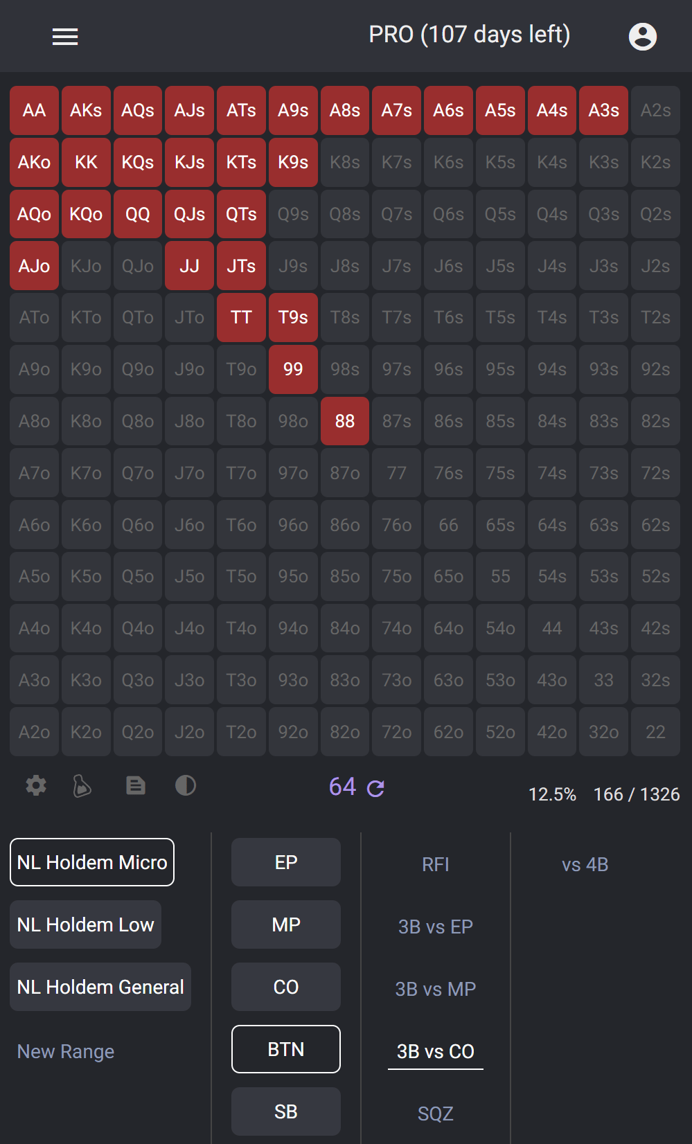 La sección Trainer está diseñada para practicar tu estrategia. Memorizar rangos es muy importante para tener un modelo preflop claro en tu cabeza. Esto hace que tus decisiones preflop sean más rápidas y que el análisis de cada mano sea mucho más claro.