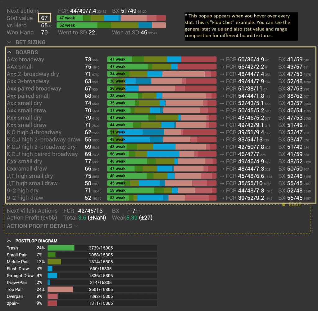 - Competent combination of preflop and postflop statistics in popups allows you to quickly get all necessary information, not waste time switching between popups, and focus on the thoughts of the hand.