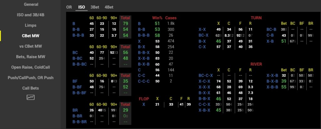 The river sizings are also displayed. It allows us to spot unpolarized river bets. This means we can bet less than pot with a near-nuts so that the opponent doesn’t fold, and bet full pot as a bluff for more fold-equity.