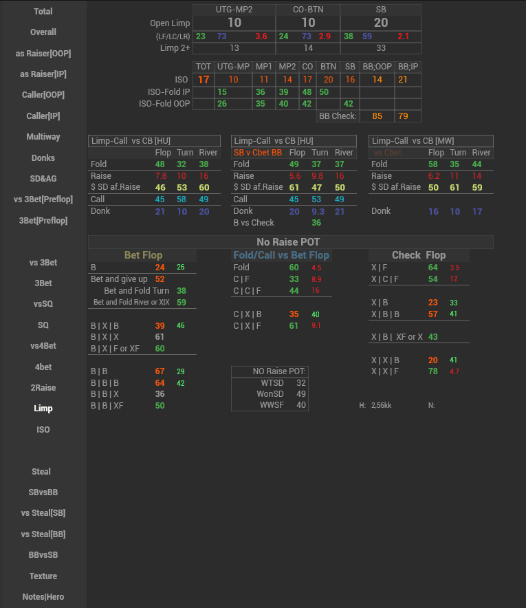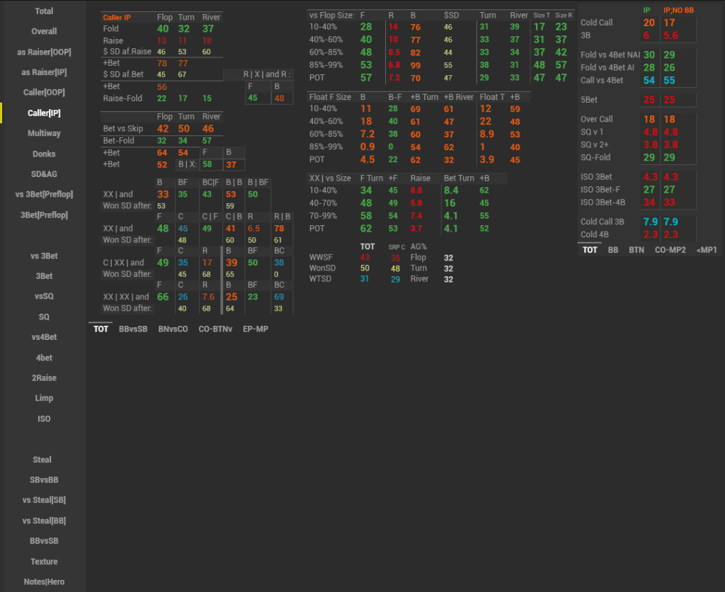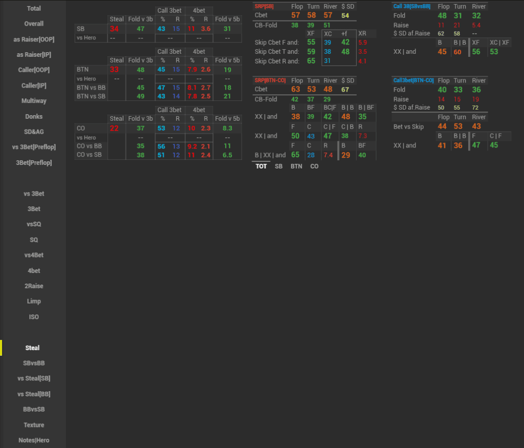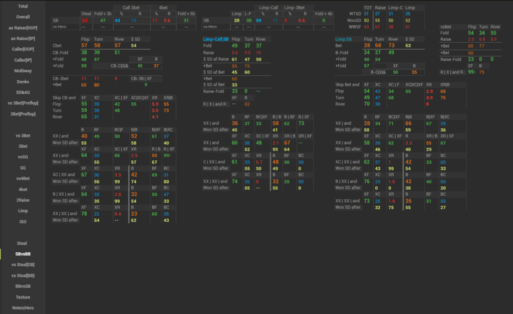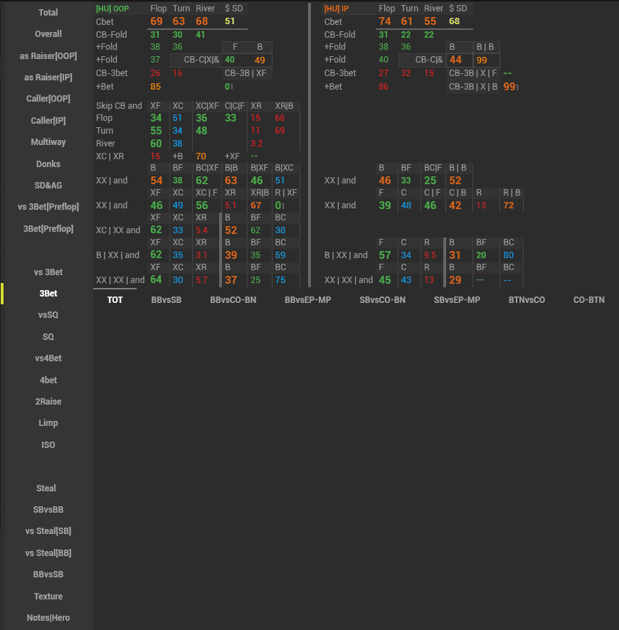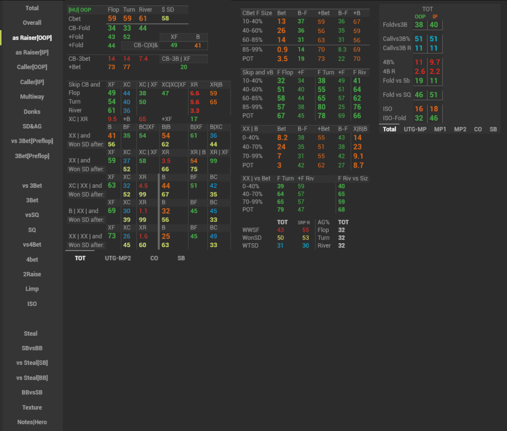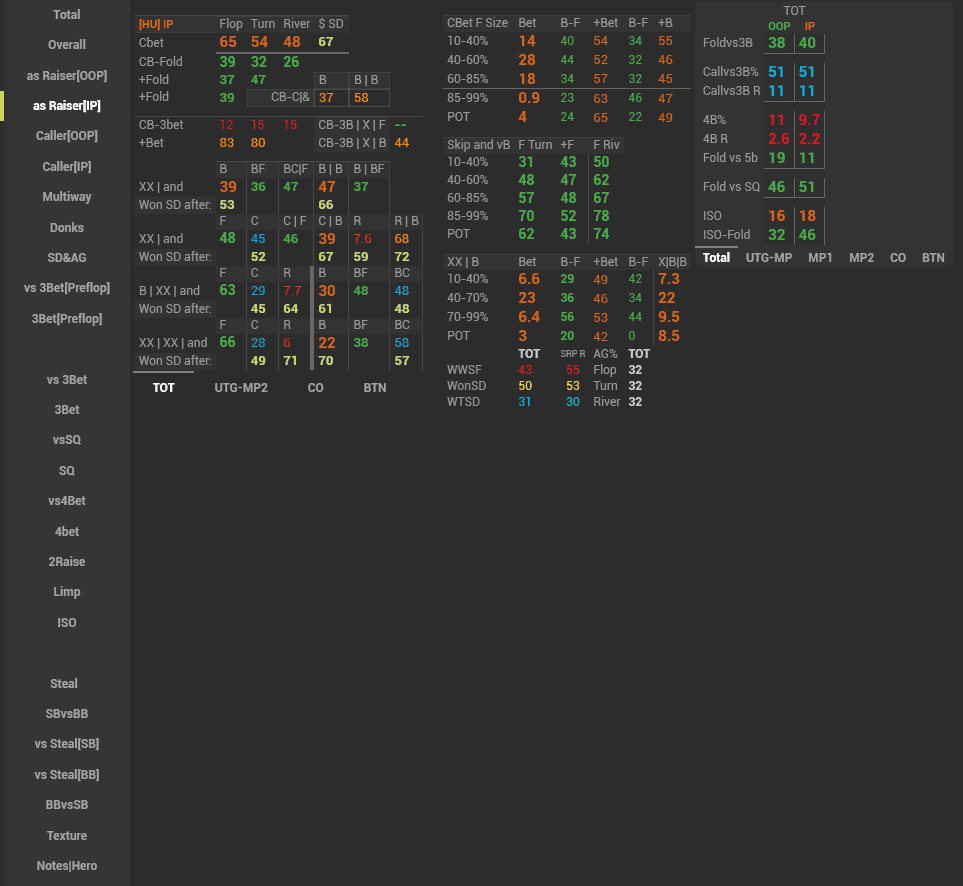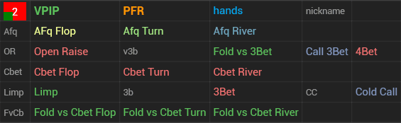 In this HUD we have displayed a major part of GTO on the preflop and how our opponents deviate from it, as well as tried to stress the main leaks of the player pool. This HUD is suitable both for a training session and for analyzing your own game or your opponent’s game away from the tables.