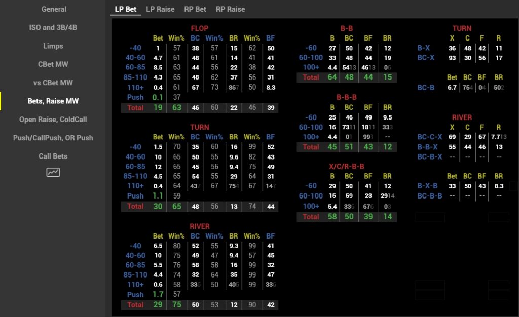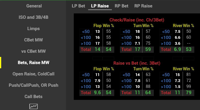 1. Aggression on specific streets, total and split by single-raised pots, 3bet-pots and multiway pots. Opponents are often skewed towards aggressive or tight play in specific spots.