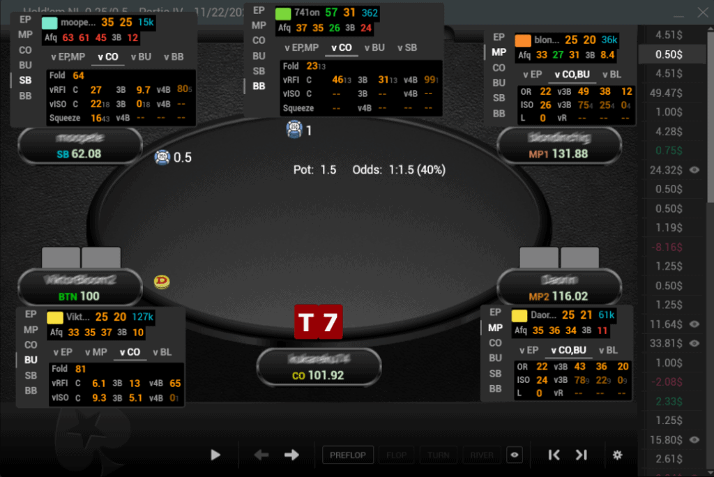 This hud fully meets the requirements of PokerStars. Despite the fact that the HUD is static and does not change during the hand, it is very functional and effective. You can quickly find relevant information for the current game situation by switching between positional tabs.