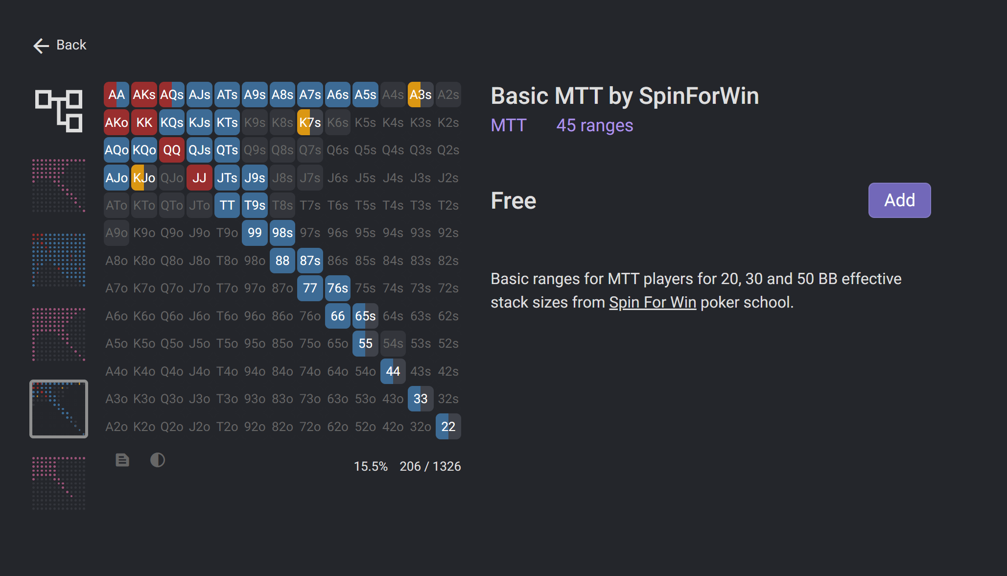 Para jogadores de MTT, há um pacote de tabelas preflop de MTT pela escola de poker SpinForWin. Além disso, você também tem tabelas ICM Push-Fold que são mais relevantes para as fases finais dos torneios quando você tem um stack curto.