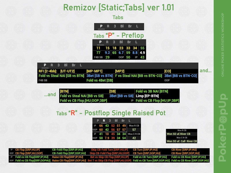 В комплекте содержится более 20 попапов для всевозможных игровых сценариев и 3 хада. Вы можете использовать динамический HUD, чтобы видеть только самую актуальную статистику для текущего этапа раздачи. Также в наборе 2 статичных HUD – для тех, кто предпочитает классику, а также для регуляров PokerStars.