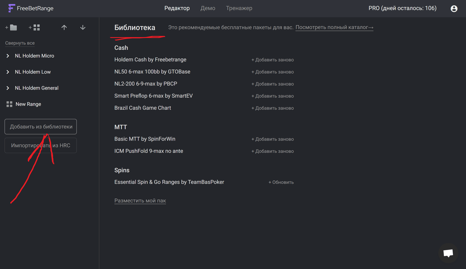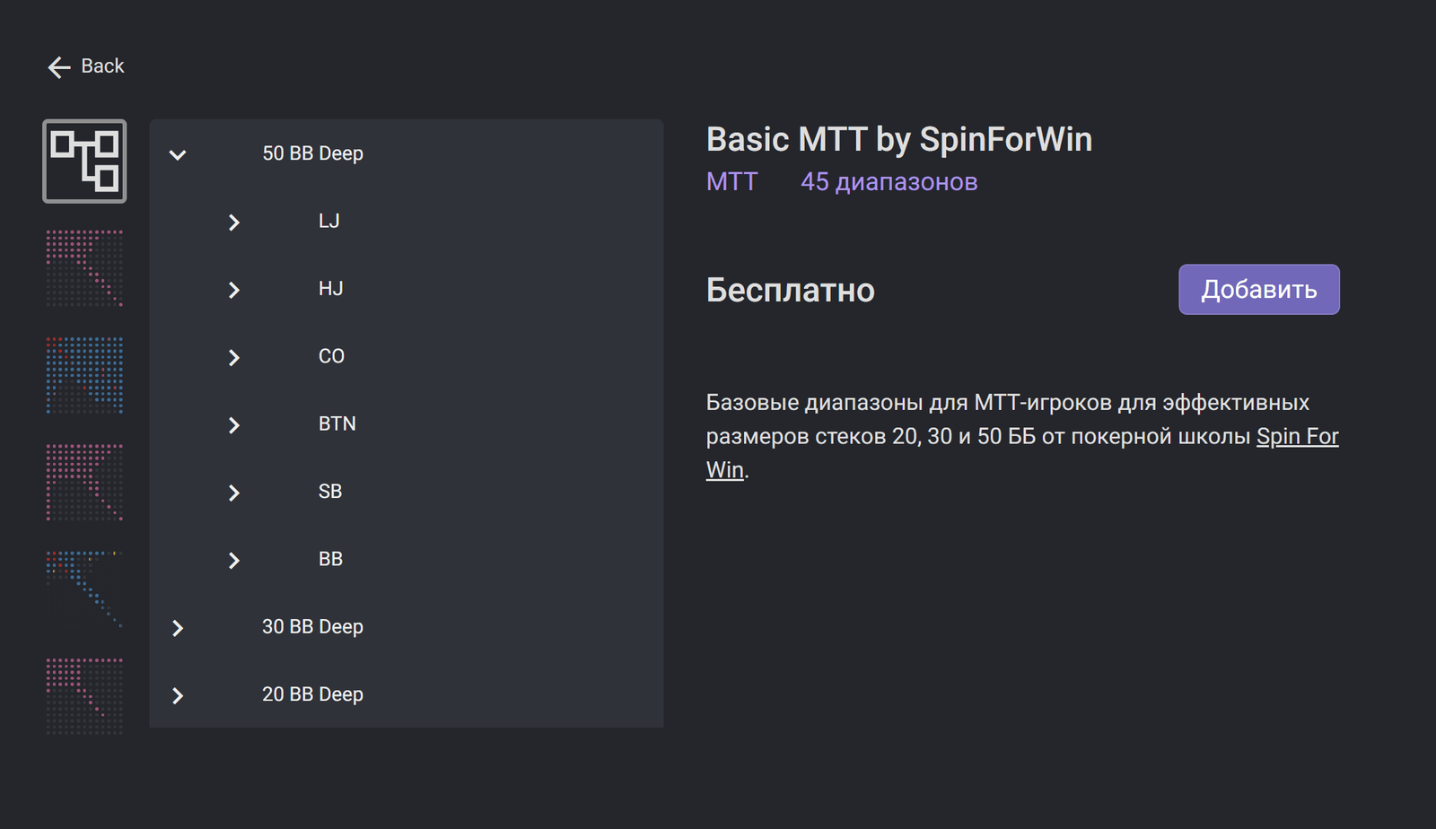 • Готовые префлоп-чарты для кэша, MTT и Spin&Go игр в Библиотеке.