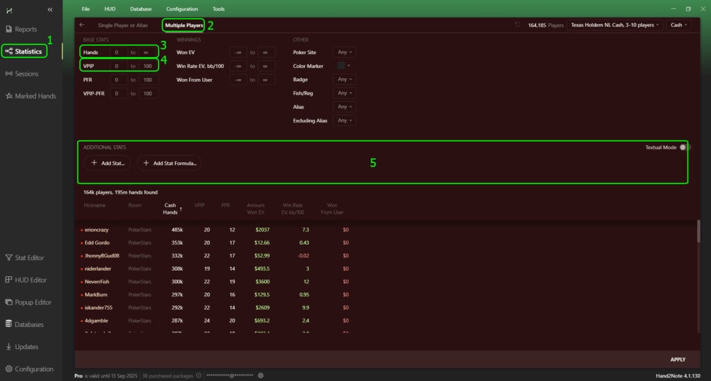 The data entry menu for “Multiple Players” is located in Statistics (1). Then, click on the player’s nickname icon and go to Multiple Players (2). The parameters VPIP and total hands are entered via BASE STATS (3) and (4). To add AFq and WSD, you will need the ADDITIONAL STATS (5) menu.