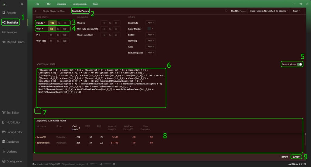 In the Multiple Players window, find the parameters “VPIP” (3) and “Hands” (4) and set the required values (for fish-maniacs: VPIP – 50 or higher, hands – 100 or more). Then, switch the ADDITIONAL STATS menu to “Textual Mode” (5) and paste the formula (6) we created earlier to find fish-maniacs. When you paste the formula, Hand2Note will validate it, and if correct, a green checkmark (7) will appear below. Wait until the (8) area shows the number of players found by the criteria, their total hands, and nicknames, then click “APPLY” (9) to start merging their statistics.