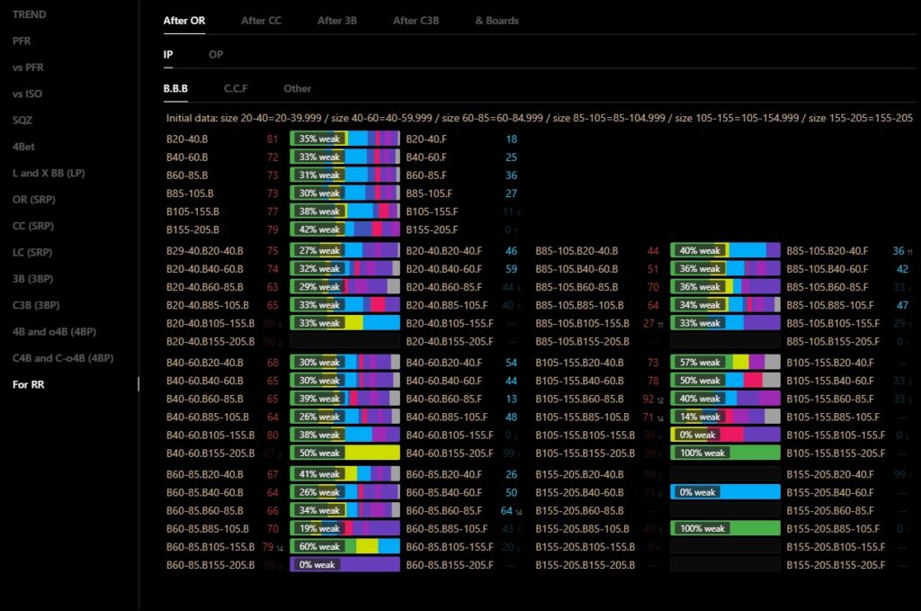 ((Cases(tot_F_B) + Cases(tot_F_R)) / (Cases(tot_F_C) + Cases(tot_F_X) + Cases(tot_F_F) + Cases(tot_F_B) + Cases(tot_F_R))) * 100 > 40 and ((Cases(tot_T_B) + Cases(tot_T_R)) / (Cases(tot_T_C) + Cases(tot_T_X) + Cases(tot_T_F) + Cases(tot_T_B) + Cases(tot_T_R))) * 100 > 40 and ((Cases(tot_R_B) + Cases(tot_R_R)) / (Cases(tot_R_C) + Cases(tot_R_X) + Cases(tot_R_F) + Cases(tot_R_B) + Cases(tot_R_R))) * 100 > 38 and (WonHandAtShowdownCases(tot_F_C) + WonHandAtShowdownCases(tot_F_X) + WonHandAtShowdownCases(tot_F_F) + WonHandAtShowdownCases(tot_F_B) + WonHandAtShowdownCases(tot_F_R)) * 100 / (WentToShowdownCases(tot_F_C) + WentToShowdownCases(tot_F_X) + WentToShowdownCases(tot_F_F) + WentToShowdownCases(tot_F_B) + WentToShowdownCases(tot_F_R)) < 48