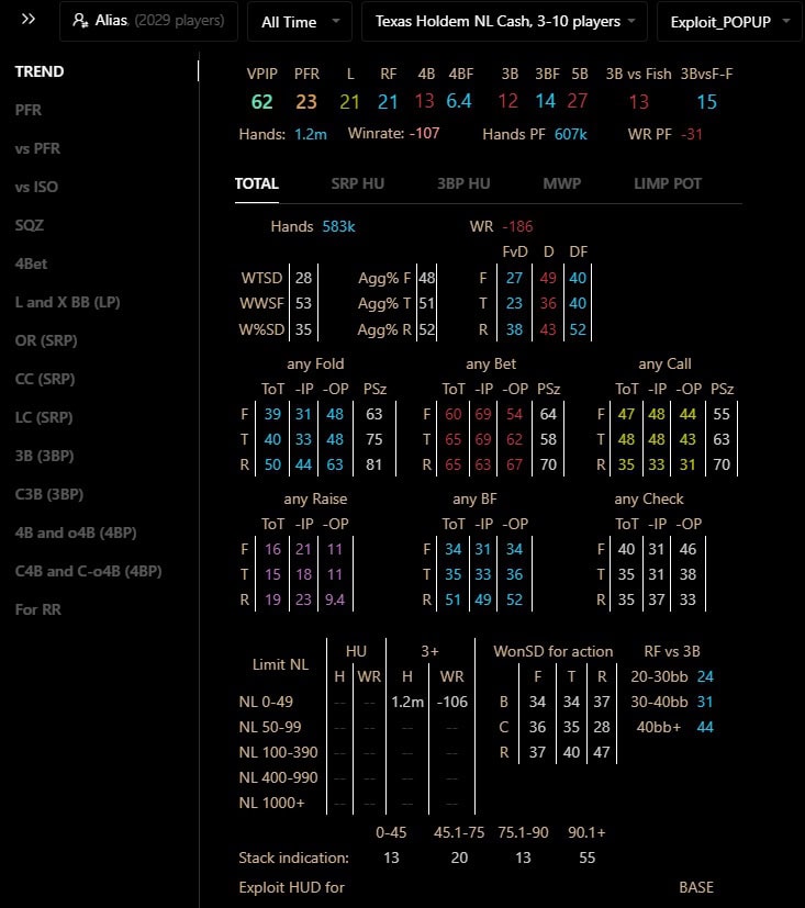 The “EXPLOIT HUD BASE” stat package allows us to break down their postflop play by bet sizing. By opening the special tab in the popup, we can see that the number of weak hands fish-maniacs continue with in various postflop lines after a preflop open-raise, considering their bet sizing, is very wide. Both in position:
