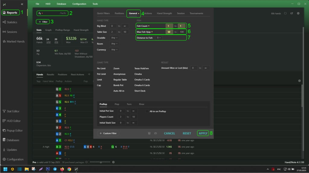 In the opened filter window, go to the “General”(4) tab. Set the number of fish at the table from 1 to 1 in area (5) and the required VPIP of the fish in area (6). Using the scheme above, set the required fish position relative to the hero in area (7) and click “OK”(8) to apply the filter.