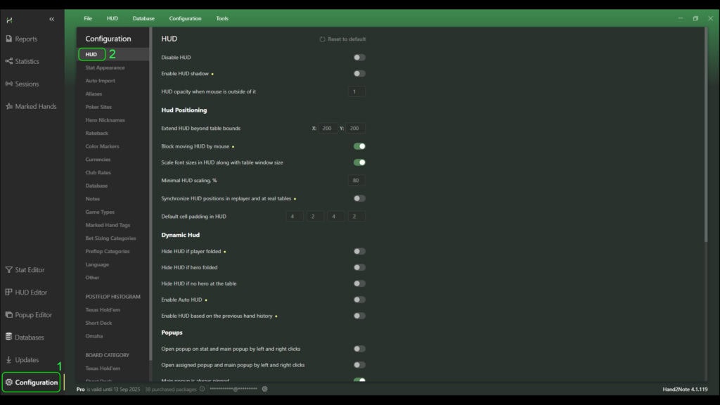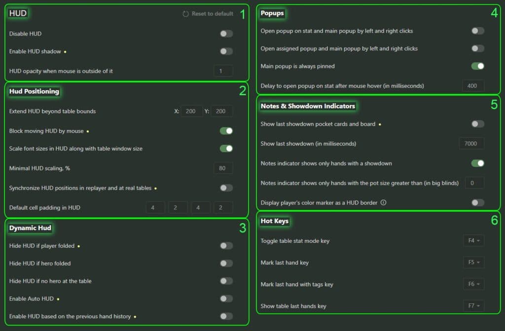 • “Hud Positioning” (2) – responsible for the location and size of Hud windows relative to the table window. As well as synchronization of Hud display settings at tables and in replayer;