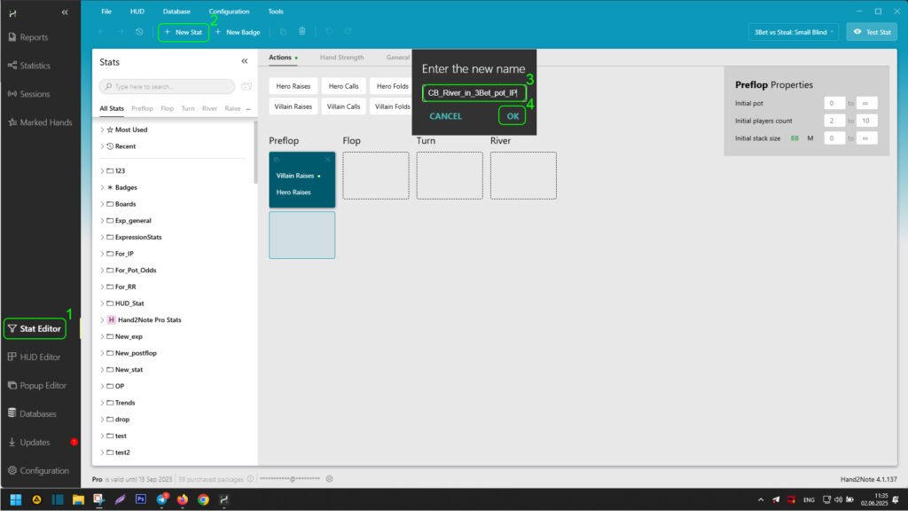 Creating a simple stat in Hand2Note follows the same sequence as the action it accounts for: