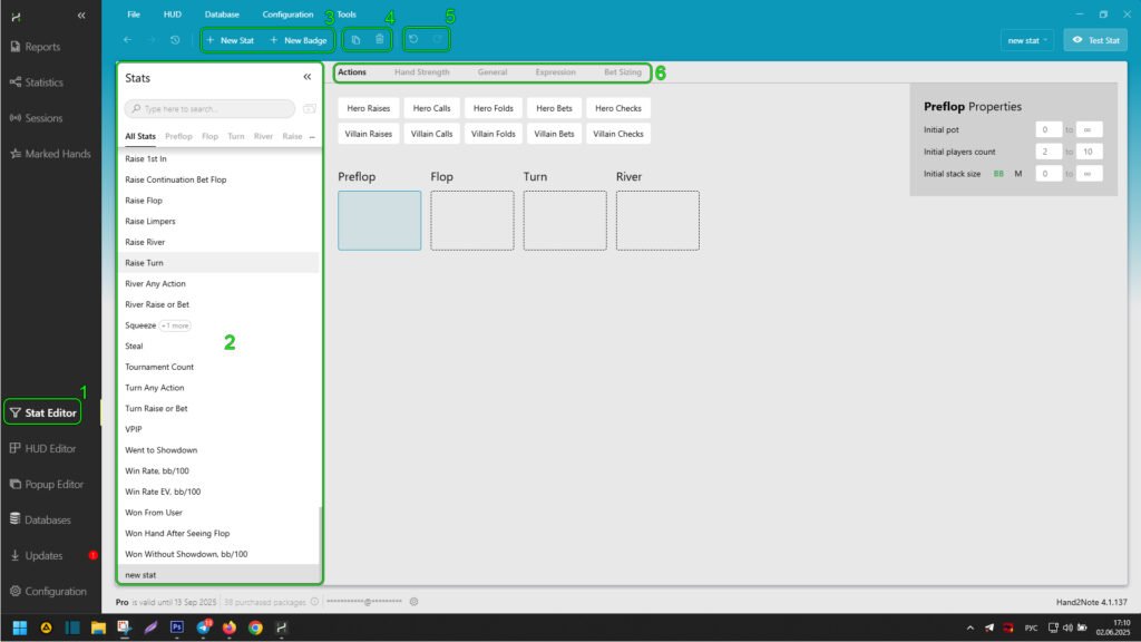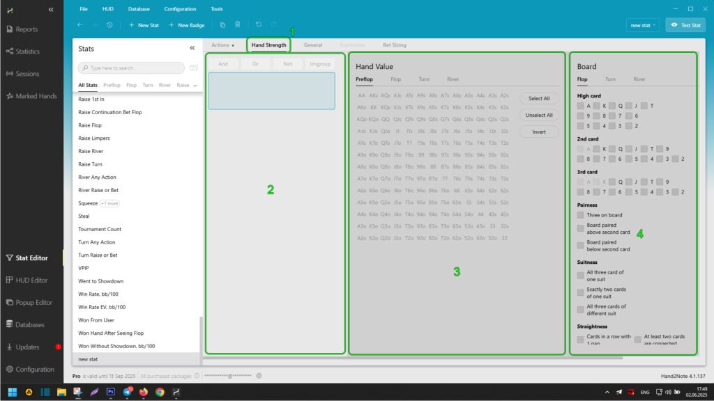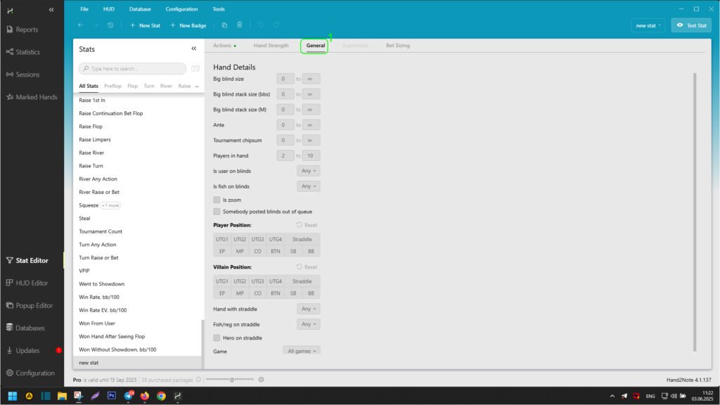 After selecting an existing or creating a new stat in the editor, click on “General” (1). Here, you can specify the basic characteristics of the hand, such as game type, poker discipline, chip value or ante, player or opponent positions, and many others.