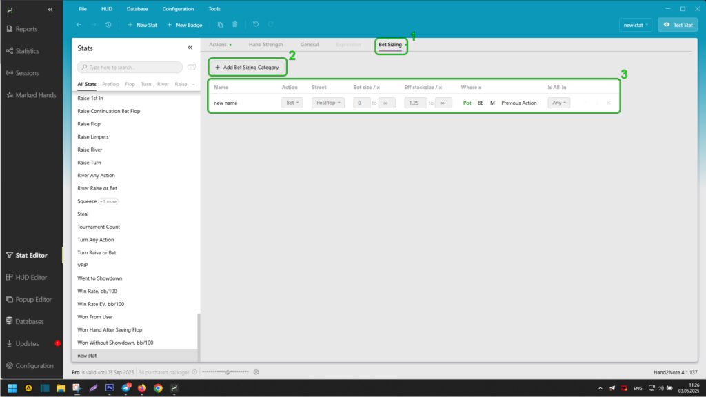 After selecting an existing or creating a new stat in the editor, click on “Bet Sizing” (1). Then, by clicking “+ Add Bet Sizing Category” (2), an area (3) will appear where you can set the bet sizes displayed in the popup on the stat.