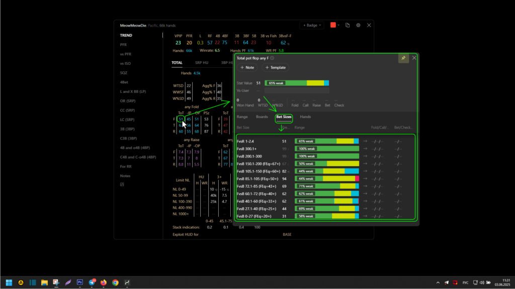 After making changes in this tab, hover the mouse pointer over the corresponding stat in the popup or HUD to display the popup on the stat. Go to the “Bet Sizing” tab, where you will see all the changes made to the stat using the “Bet Sizing” tab in the stat editor: