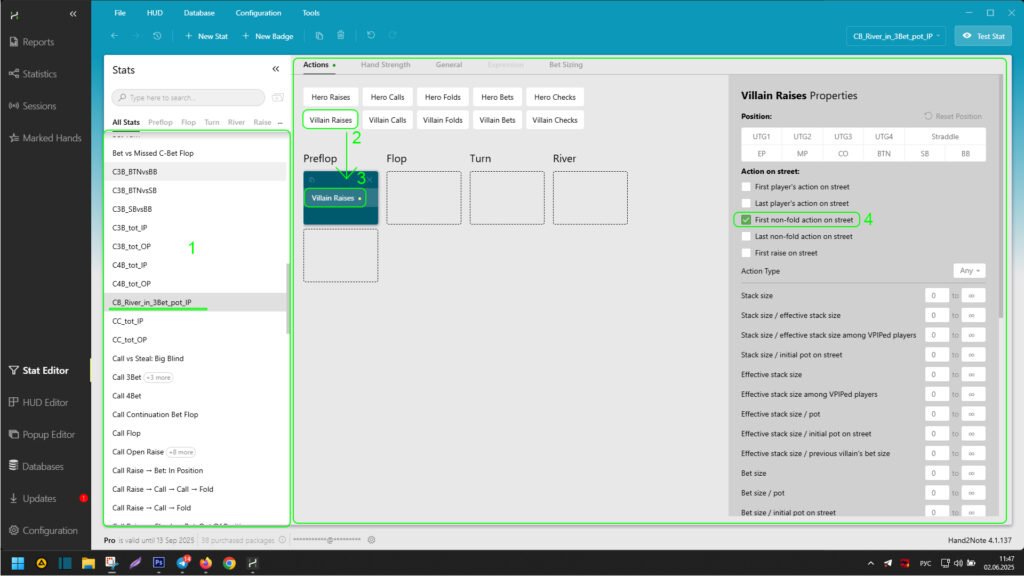 After displaying the opponent’s raise in the “Preflop” block (2), select it. In the side action settings panel, check the boxes next to “First players action on street” and “Last players action on street” (3). This way, you indicated that the player’s raise is their first and last action on the street.
