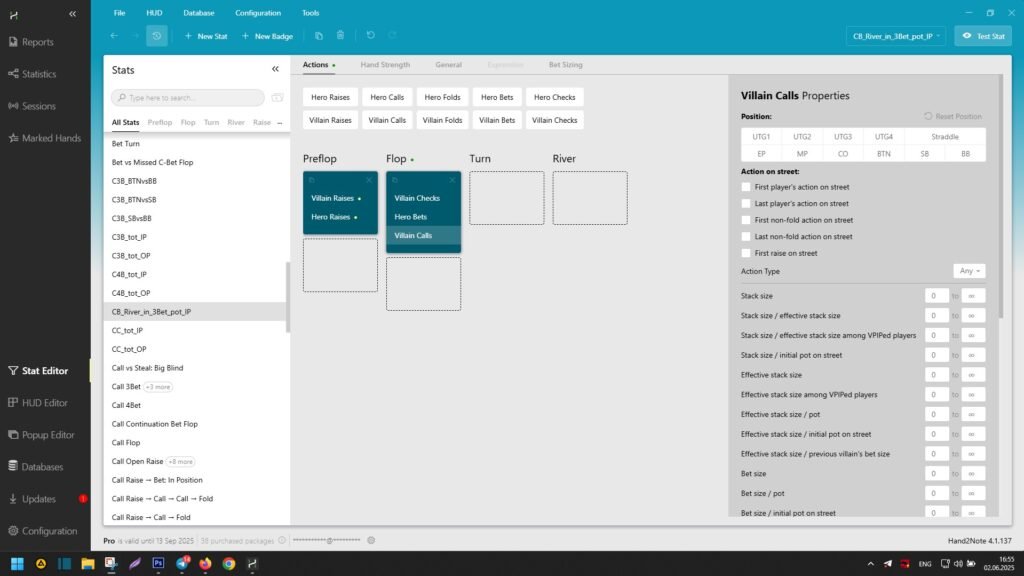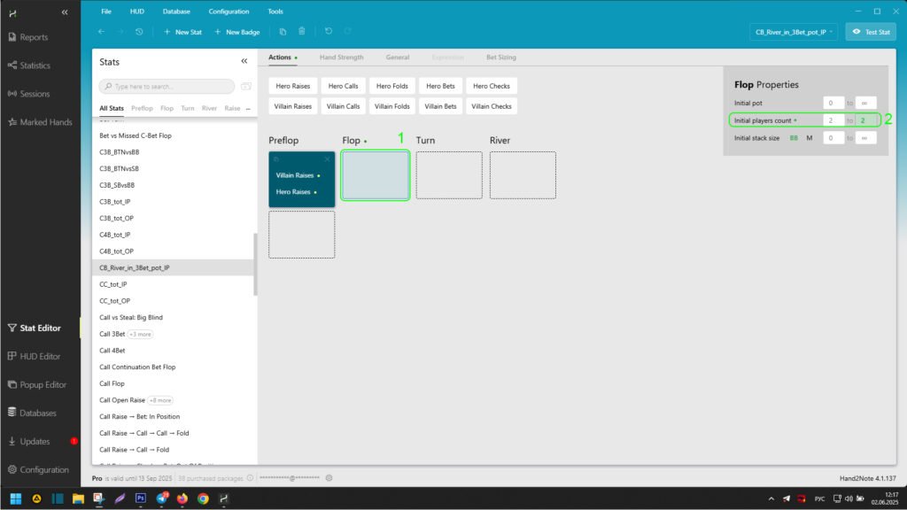 In this article, we will explain what the stat editor in Hand2Note is and also consider an example of creating a continuation bet stat on the river in a 3-bet pot. In this case, the player making the continuation bet on the river in a 3-bet pot will be in position against the remaining players in the hand. Also, no more than two players will participate in the hand on the flop, turn, and river.