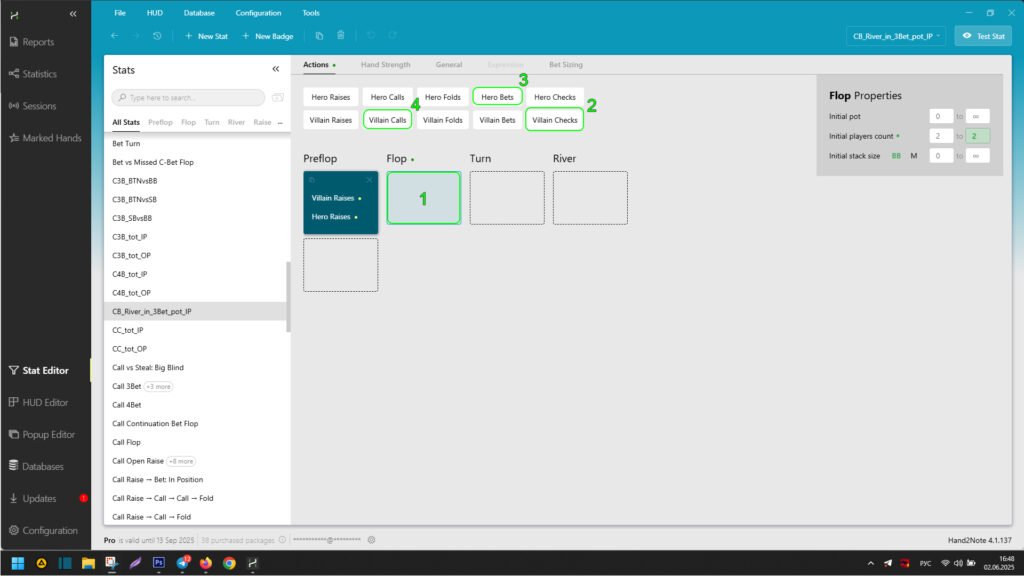 To enter them in the stat editor, select “Flop” (1), then click on “Villain checks” (2). Then immediately click on “Hero bets” (3) and “Villain checks” (4).