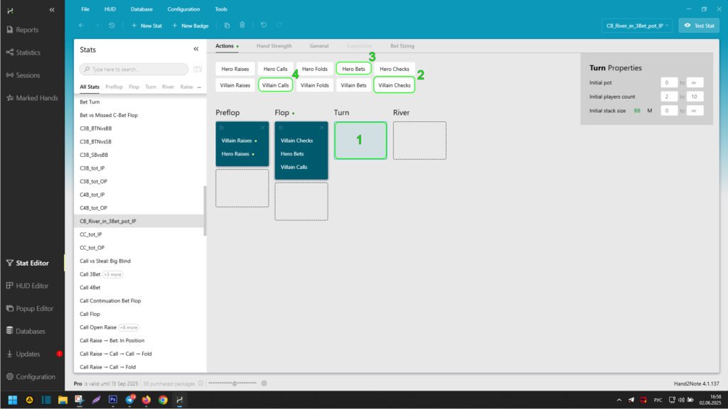 To enter them in the stat editor, select “Turn” (1), then click on “Villain checks” (2). Then immediately click on “Hero bets” (3) and “Villain checks” (4).