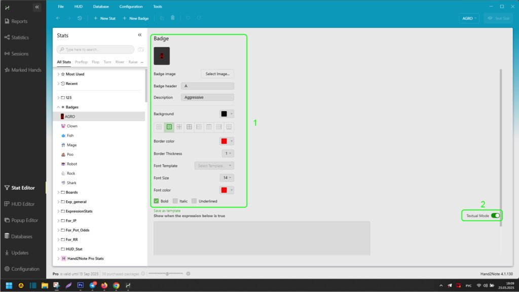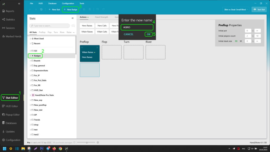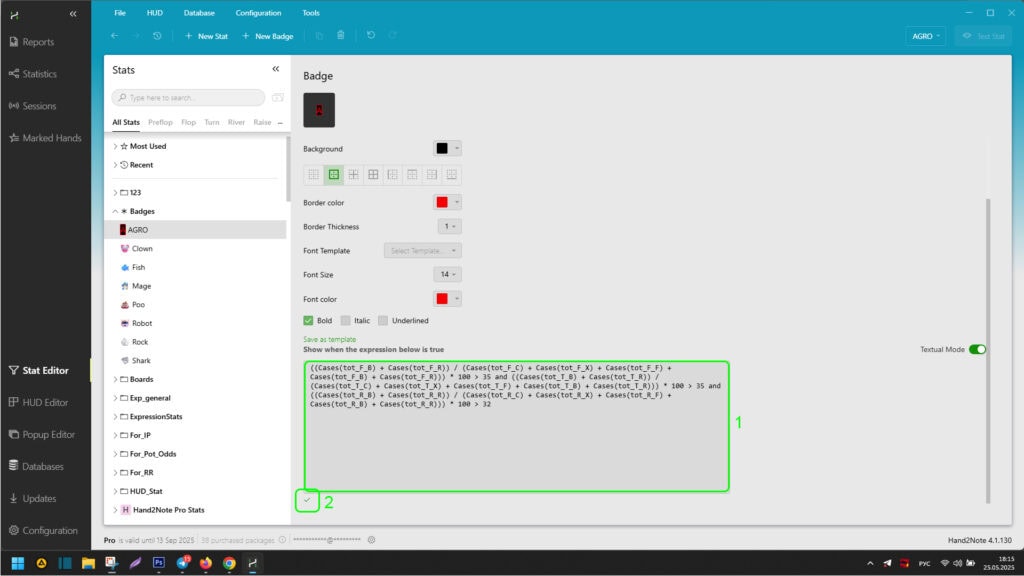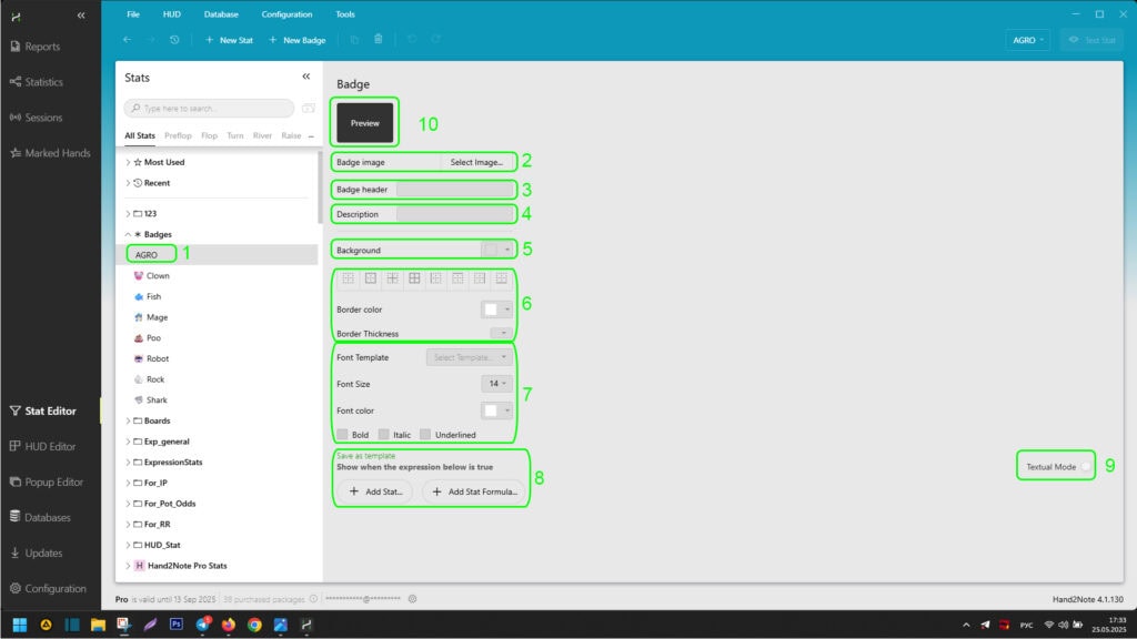 - In area (8), set the badge’s display conditions on players using the visual stat search mode in Hand2Note and include them in a logical formula;