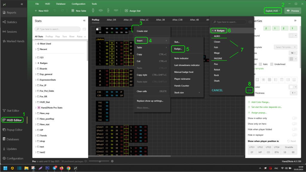 Next, right-click (3) on the free cell where you want to add a badge and hover over “Insert” (4) in the dropdown menu. In the secondary dropdown menu, select “Badge…” (5). In the opened badge search list, expand their list (6). Find the necessary badge and click on it (7). Then click “OK” (8) to add it to the HUD cell.