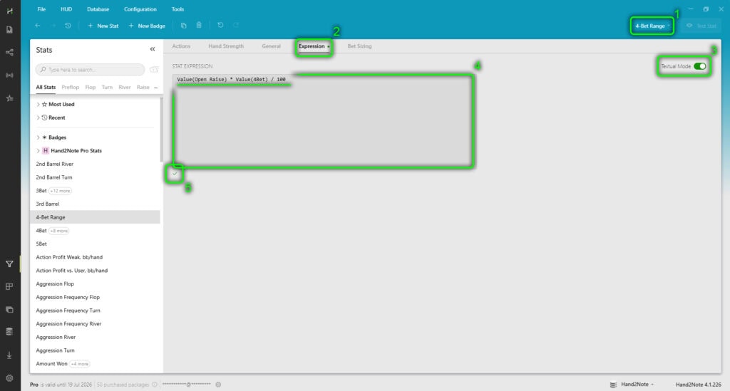 Next, you need to set the necessary parameters for the created “4-Bet Range” stat. First, make sure that after its creation, it is open for editing in the stat editor (1). Then go to the “Expression” menu (2) and select the required input condition format (3).