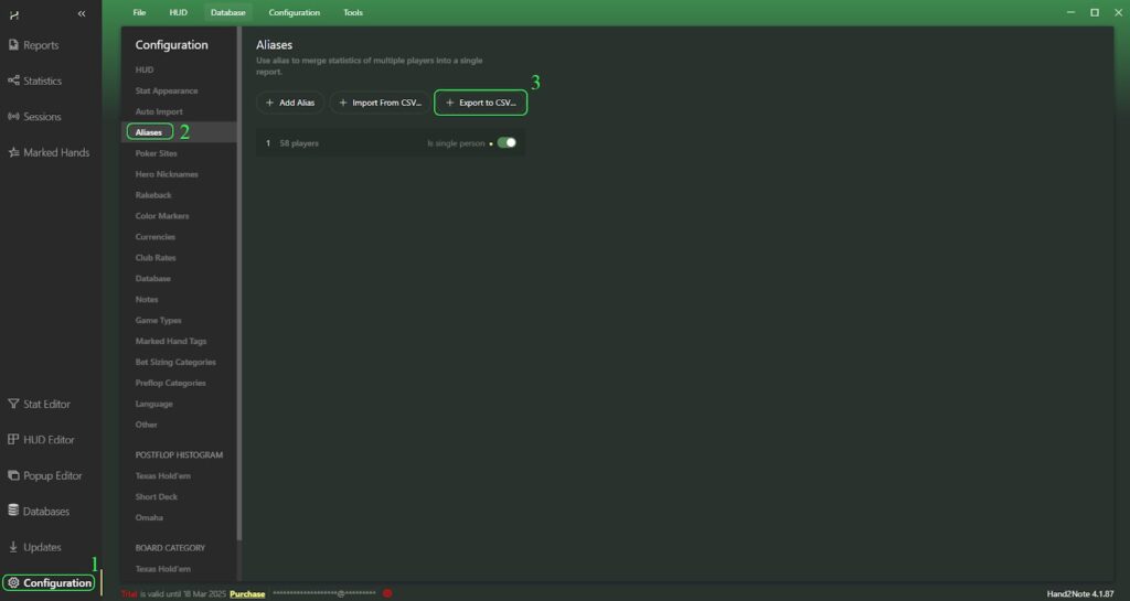 In order to export aliases from Hand2Note – in the main Hand2Note window open “Configuration”, then go to “Aliases” tab and click on “+ Export to CSV…”: