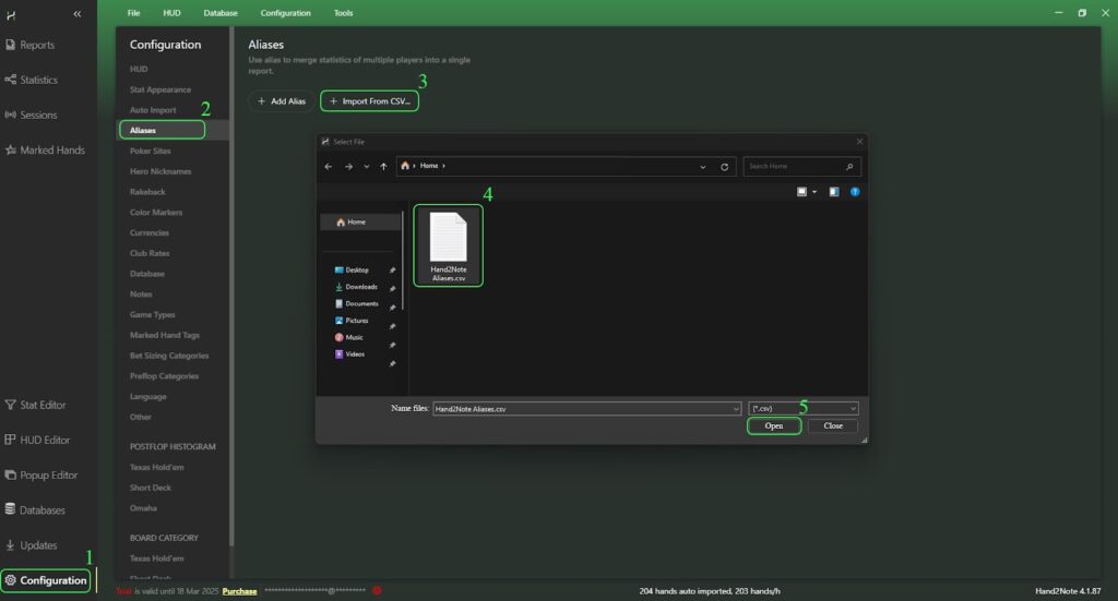 To do this, open “Configuration” in the main Hand2Note window, then go to the “Aliases” tab and click on “+ Import From CSV”, and in the opened file search menu find the alias text file you created and select it.