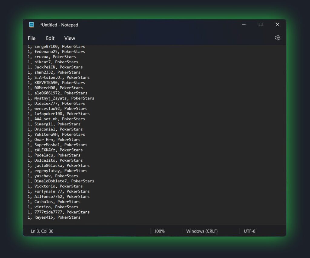 - PLAYER’S NICKNAME – specified between the alias name and the poker room name, separated by commas