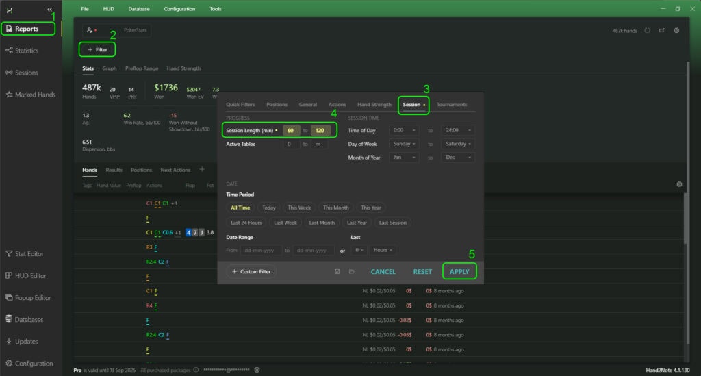 To see the overall WinRate EV, bb/100 for sessions of a certain length, we can use the “Reports” tool in Hand2Note.