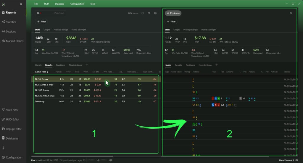 By clicking on the rows in certain tabs of the field (1) you can open an additional report window on the right, in the field (2). It will already take into account all previously applied filters, as well as the row in the tabs that you have selected (for example: NL $5, 6-max).