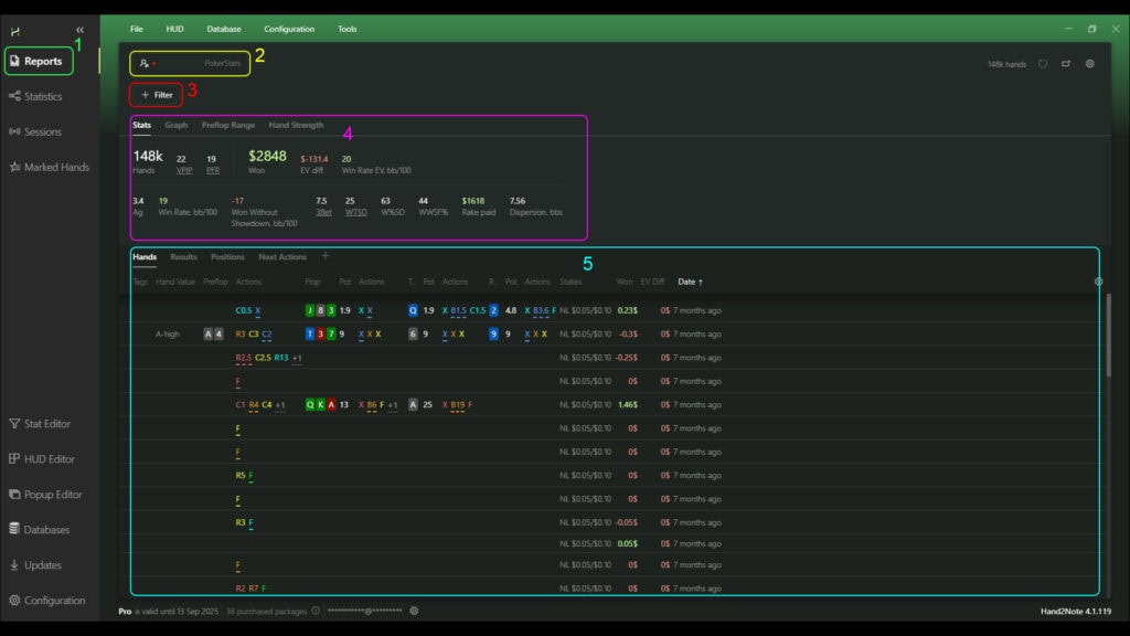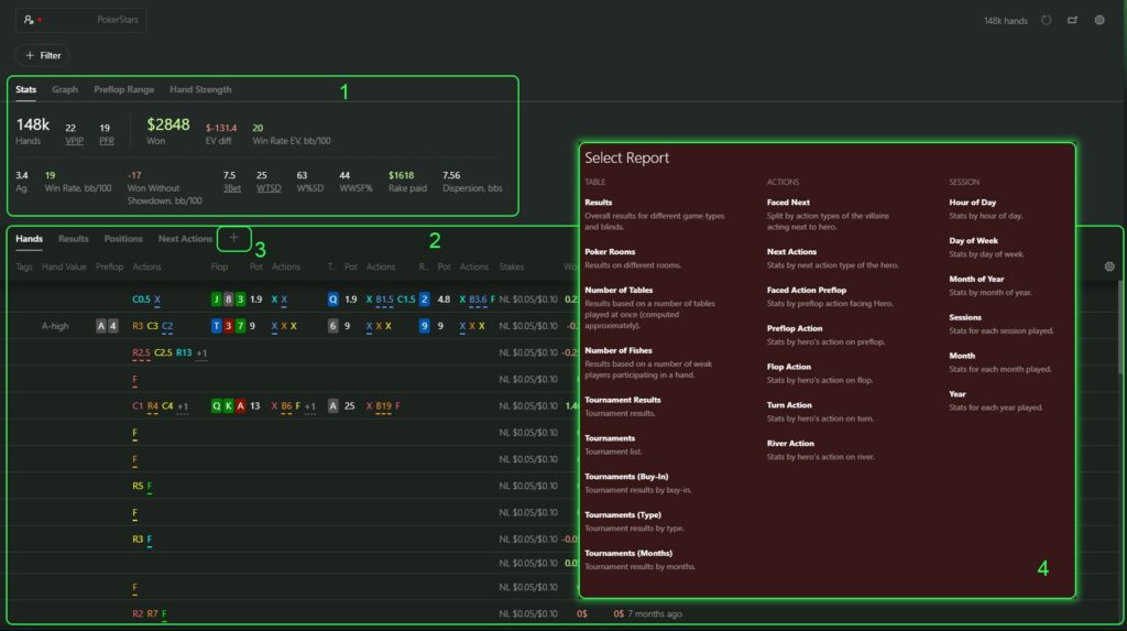 In the field (2) there are various tabs where you can see such data as: the list of hands (“Hands”), results of the game at different limits (“Results”), results taking into account different preflop positions of the player (“Positions”) and many others.