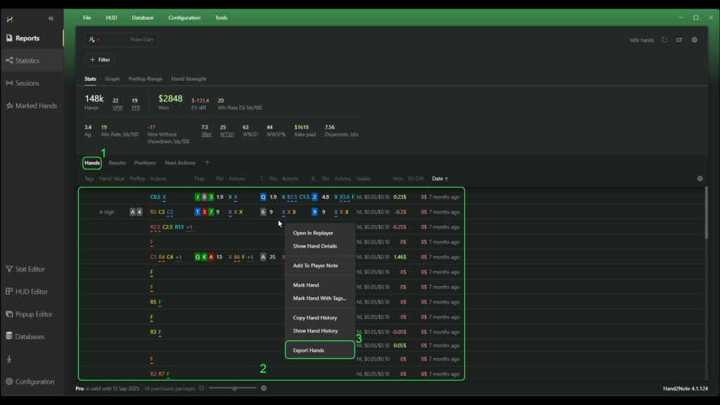 To export hands from the reports, select the “Hands” tab (1). Then, in the opened list of hands below (2), click on any of them with the right mouse button. In the drop-down list select “Export Hands” (3), and specify a saving location.