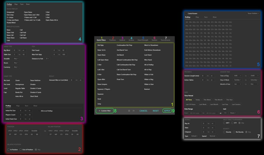 - “General” (3) tab allows you to filter statistics by the main characteristics of the game itself. For example: table size, big blind, straddle, poker room, select (the number of chips at the table with the player), currency played, game type (Hold’em, Omaha and similar), pot size and many others;