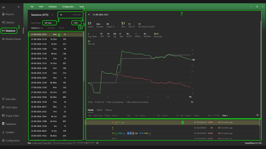 You can also select the desired time period for the session list by clicking on “All Time” (3) and choosing the period you need. You can filter by game type in the dropdown menu after clicking “Cash” (or “Tournament”) (4). Clicking on the gear icon (5) allows you to customize the visible columns in the session list (6). Clicking on any session in the list (6) will open detailed information on the right side: general stats with a win/loss graph (7) and the hand list (8).