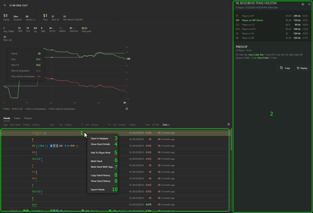 By left-clicking (1) on any hand in the list, a detailed view (2) of the hand will appear on the right side.