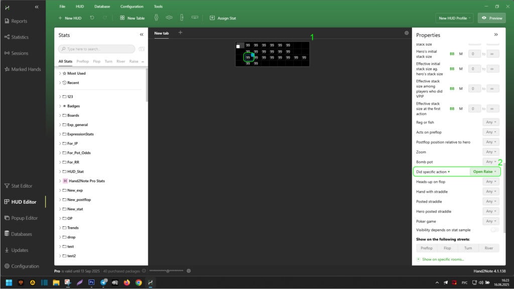 Hand2Note allows you to apply adaptive, dynamic display conditions to HUD cells or panels. This helps save space at the tables and adapts the display of information, showing it when it is most relevant.