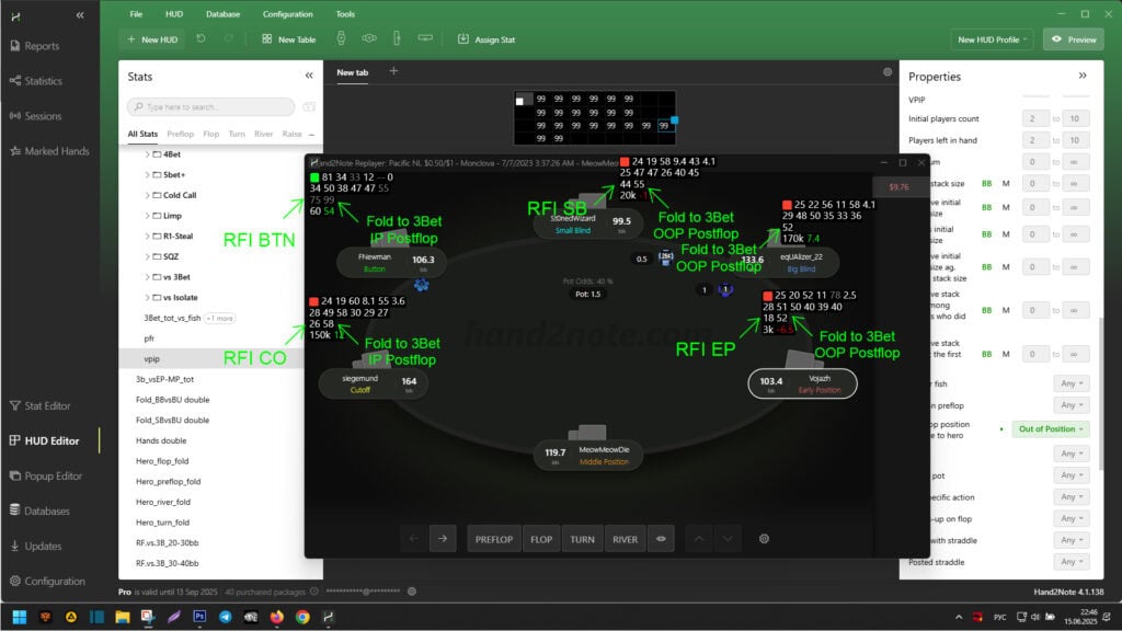 - The third row uses positional display conditions and shows stats “RFI UTG”, “RFI EP”, “RFI MP”, “RFI CO”, “RFI BTN”, “RFI SB”, “Fold to 3Bet IP postflop”, “Fold to 3Bet OOP postflop” according to the players’ positions at the table;