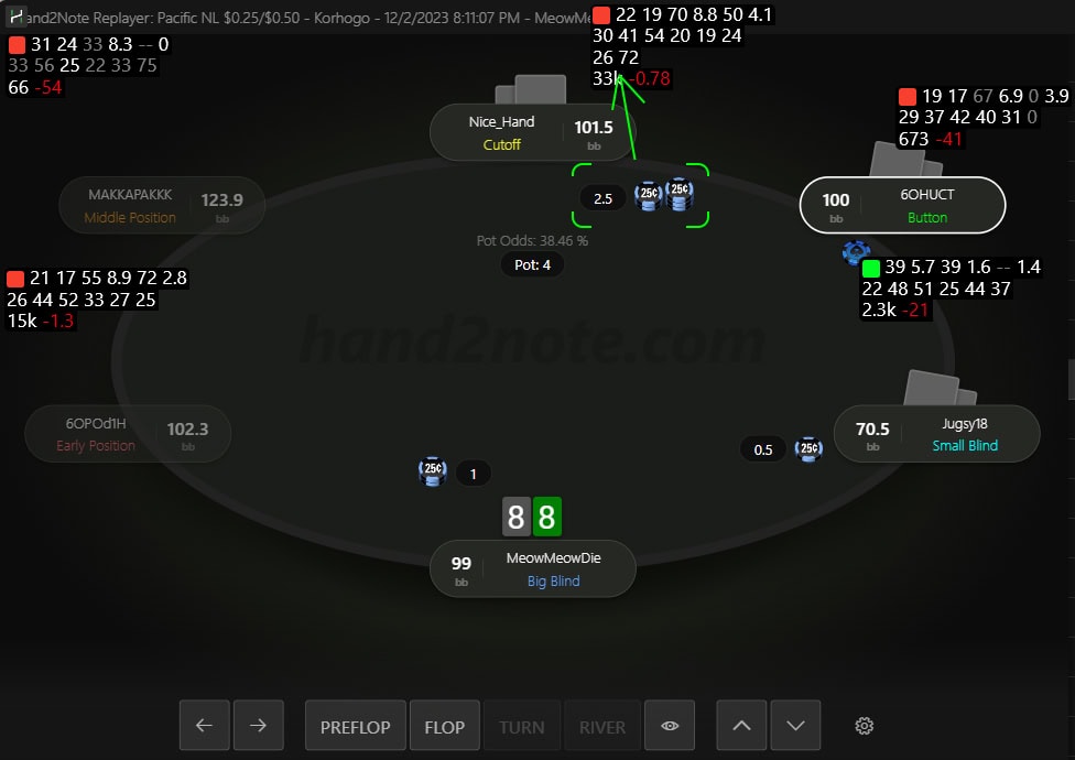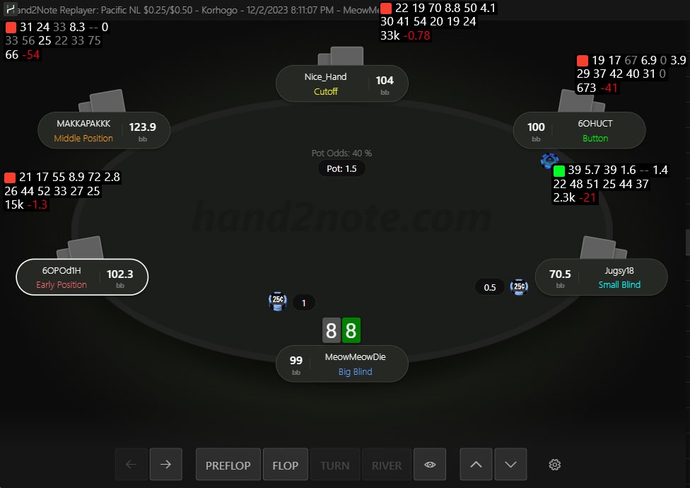 Now, in the third row, no more than two stats are visible and only in the HUD of the player who made the open raise. The first stat on the left displays RFI according to the position the player occupies. The second stat shows Fold to 3Bet, according to the position the player may occupy on the flop, turn, or river against the hero (in position – IP, or out of position – OOP).