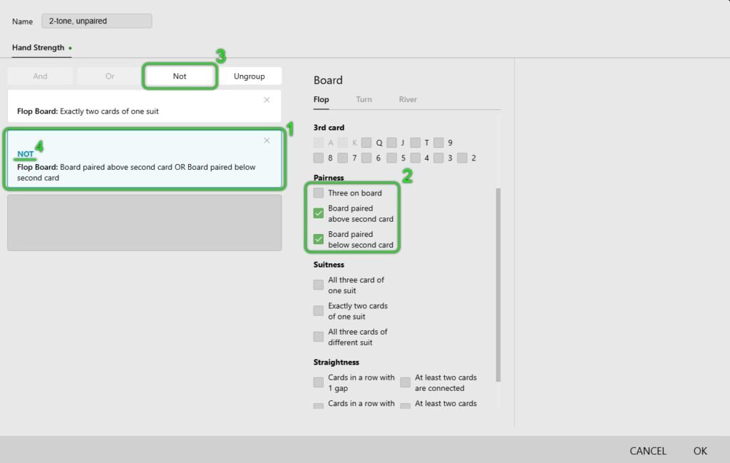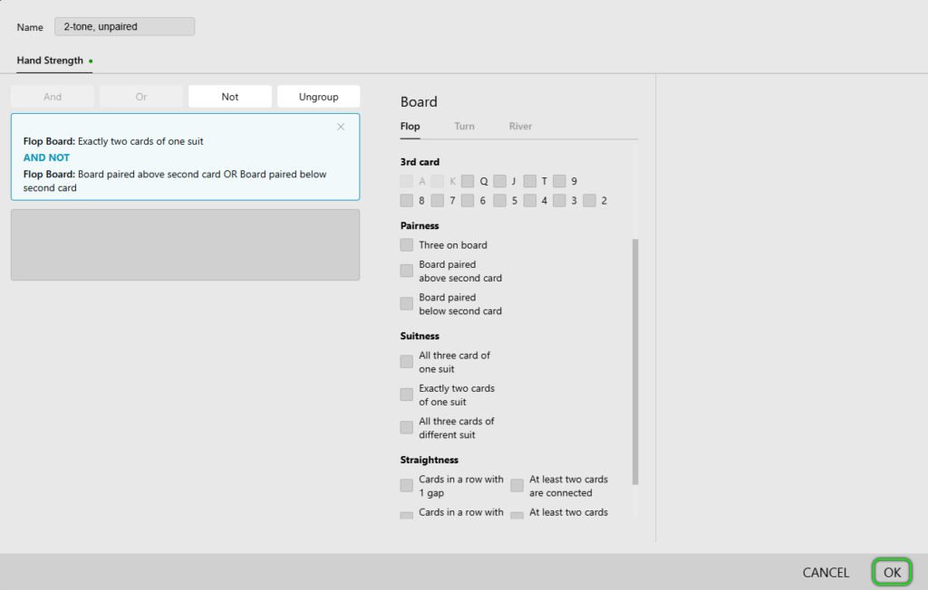In this example, we will consider creating a category for analyzing flops in Texas Hold’em, which will help track important game situations. This category includes flops with the following characteristics: