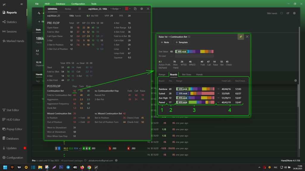 Hand2Note allows you to edit board categories used in the stat popup. This enhances analysis capabilities by refining player actions based on board textures.
