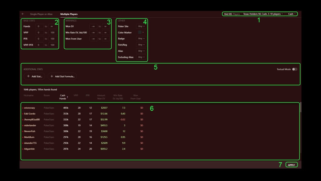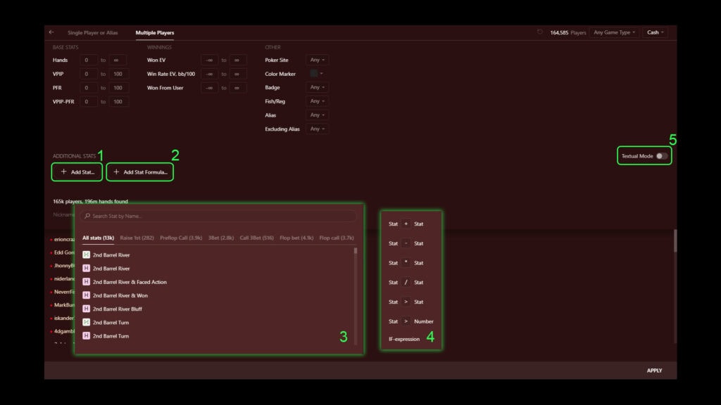 - “ADDITIONAL STATS”(5) – window for creating formulas for filtering based on stats available in Hand2Note;
