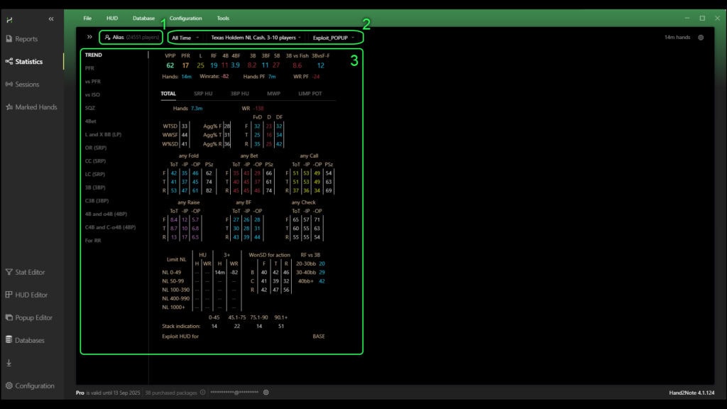 In the statistics, the successful completion of the calculation will be indicated by the display of the word “Alias” and the number of players included in the calculation in the column of the player’s nickname (1). To the right of the nickname you can double-check or change parameters such as: “Game Types”, and popup (2). In the area below, you can read the result of the calculation and study or analyze their game (3).