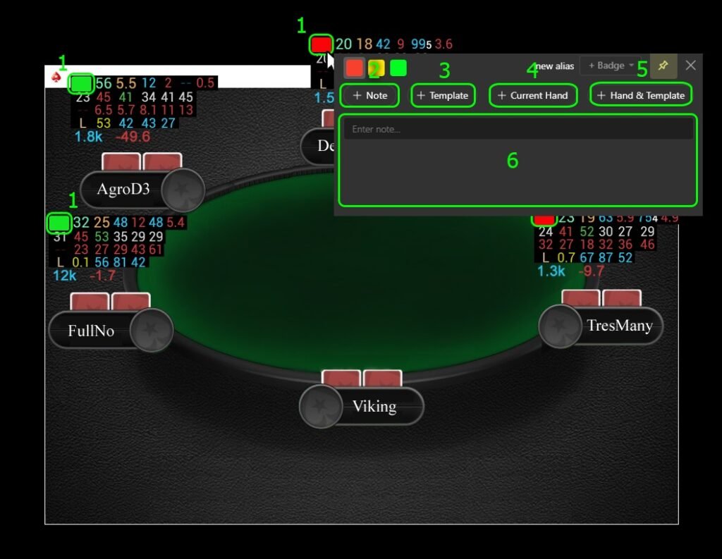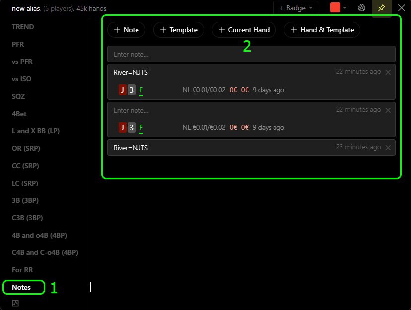 - Add a note from templates and the last hand played by the opponent at the table together, in one line of the notes list (5).